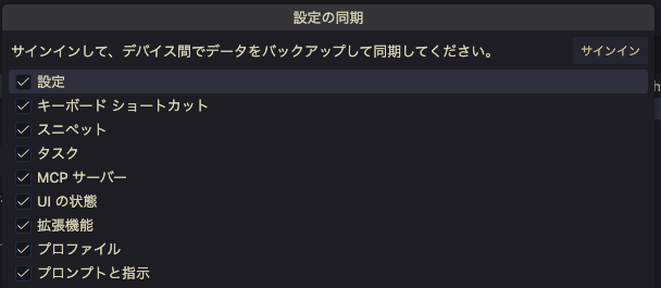 - 「Code」-> 「基本設定」-> 「バックアップと同期の設定」 を選択する。